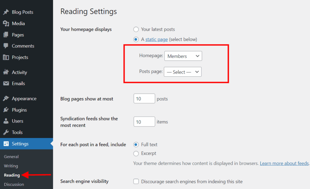 4. Make sure it is not assigned to the “Posts Page” option (Settings > Reading) :